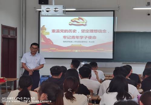 为贯彻习近平总书记党史学习要求,立足提升学生党员的党性修养,世界杯(中国)党总支开展“支部书记讲党课”活动,2021年6月18日下午,第二学生党支部书记朱占收老师为全体学生党员和入党积极分子上了一堂生动的党史专题辅导课。