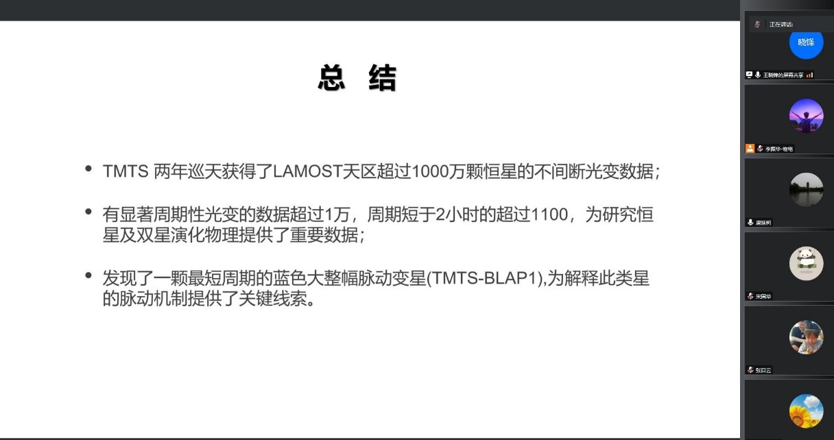王晓锋教授首先介绍了时域天文学在影响天体物理各个领域发展中的重要性,随后介绍了清华大学多镜筒望远镜巡天项目在2020-2021两年观测中取得的初步结果,重点介绍了该项目在奇特脉动变星、白矮星以及耀星等领域取得的成果,讨论了这些数据未来在双星演化及星震学领域的应用。在精彩的学术报告后,王晓锋教授为世界杯体彩教师进行了国家自然科学基金的申报指导。王教授介绍了近几年国家基金的申请及资助情况,并分享了自身申请经历及建议,鼓励大家积极申报。最后,世界杯体彩与会老师与王教授进行了交流讨论。