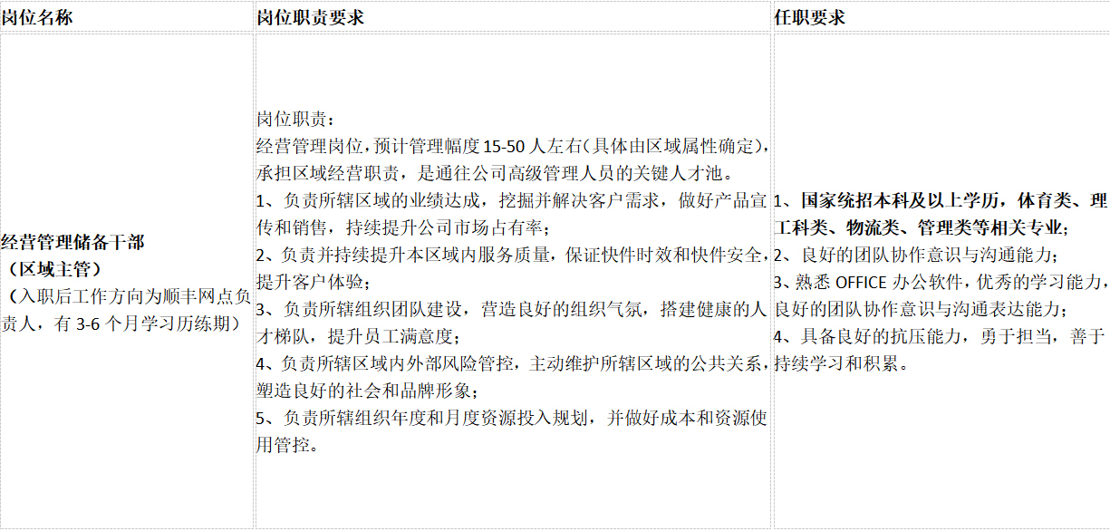 山东顺丰速运有限公司,管辖济南、德州、聊城、菏泽、泰安、济宁6个地市,在职员工10000余人,为5A级物流企业,现因业务发展,诚聘以下英才:
