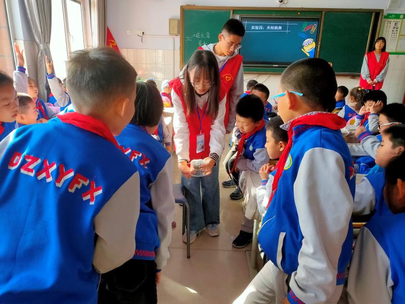 活动共分三个部分分组来进行,首先由活动小组组长向小学生们详细讲述几个科学实验的原理并播放视频与学生们互动。随后,随机向小朋友们提问了视频中的科学实验问题,并给予答对的小朋友相应的奖品奖励。最后,考虑小朋友们做实验时间的快慢、桌面整洁程度、秩序的好坏和最终实验的结果等多种因素评选出最优小组,并向获奖的小朋友们颁发了奖状。整场活动气氛活跃、热烈,小朋友们在愉快轻松的氛围中,不仅学到了基础的科学知识,更体验到了科学的魅力。