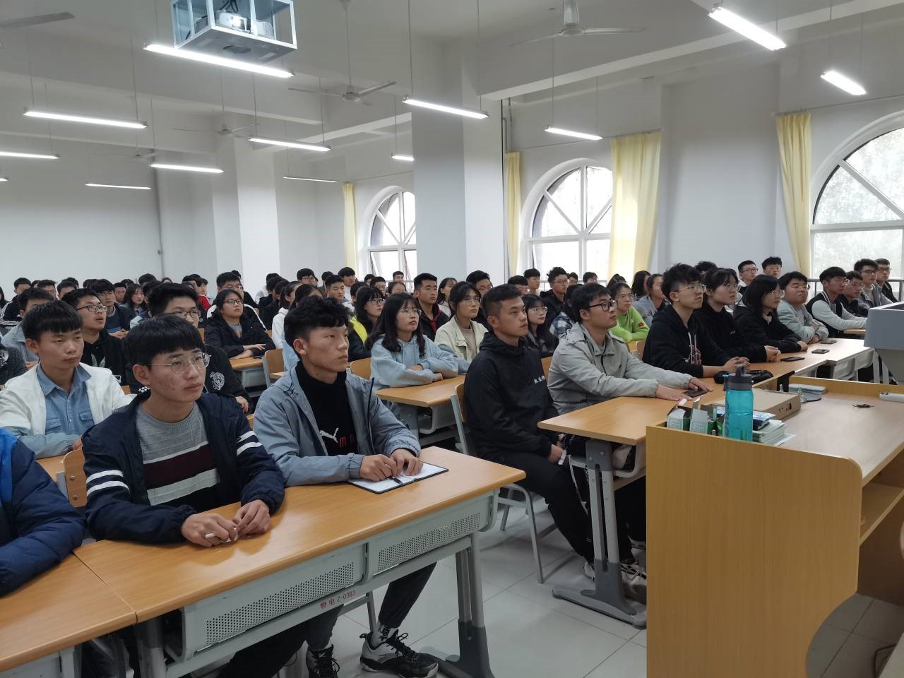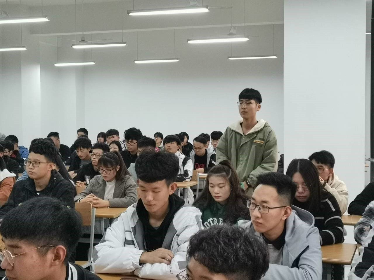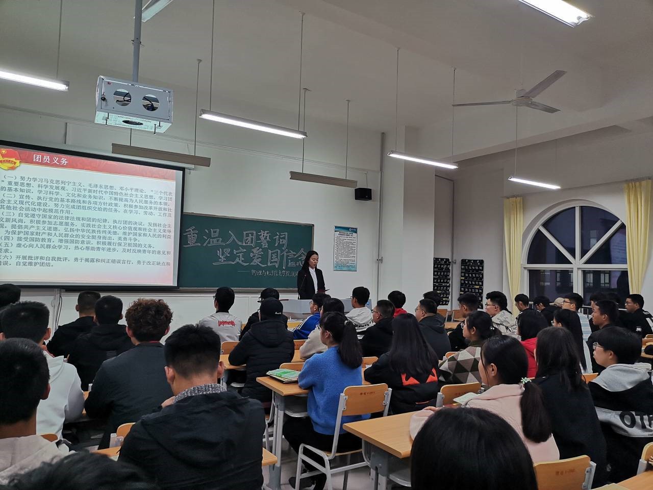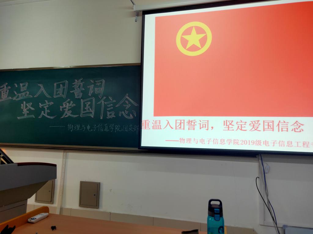活动伊始,全体同学挺直腰板,带着饱满的热情迎接活动的到来。全体同学首先站立奏唱国歌,心中的民族自豪感、国家使命感油然而生。唱完国歌后,是“重温入团誓词环节”,团员们在团支书的带领下面向团旗进行了宣誓,全体团员青年起立,高举右手进行入团宣誓,铮铮誓词在室内回荡,每位团员表情庄严肃穆,誓词铿锵有力!随后,同学们听团支书宣读《团章》中有关团员权利与义务的条款,更加明确了自己的责任,并再次全体起立面向团旗奏唱团歌。借着这首高昂的团歌,在场的青年学子将一腔激情倾诉而出。最后,同学们一起观看爱国视频——《我们走在大路上》。活动结束后,同学们都积极地举手发表了自己对宣誓仪式和爱国视频的心得体会。