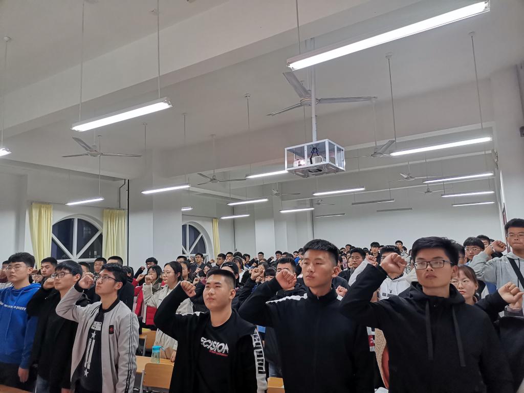 2019年11月8日晚,为深入学习习近平总书记系列重要讲话精神,践行“一学一做,即学习总书记讲话,做合格共青团员”的教育实践活动。世界杯(中国)团总支带领2018、2019级各团支部在明理楼举办了“重温入团仪式”活动。活动采用录像方法记录活动过程,活动包括唱国歌、团歌,宣誓团员誓词,宣读团员权利和义务,团旗,团徽的制作、使用和管理方法,团歌的使用和管理方法等以及观看入团视频。
