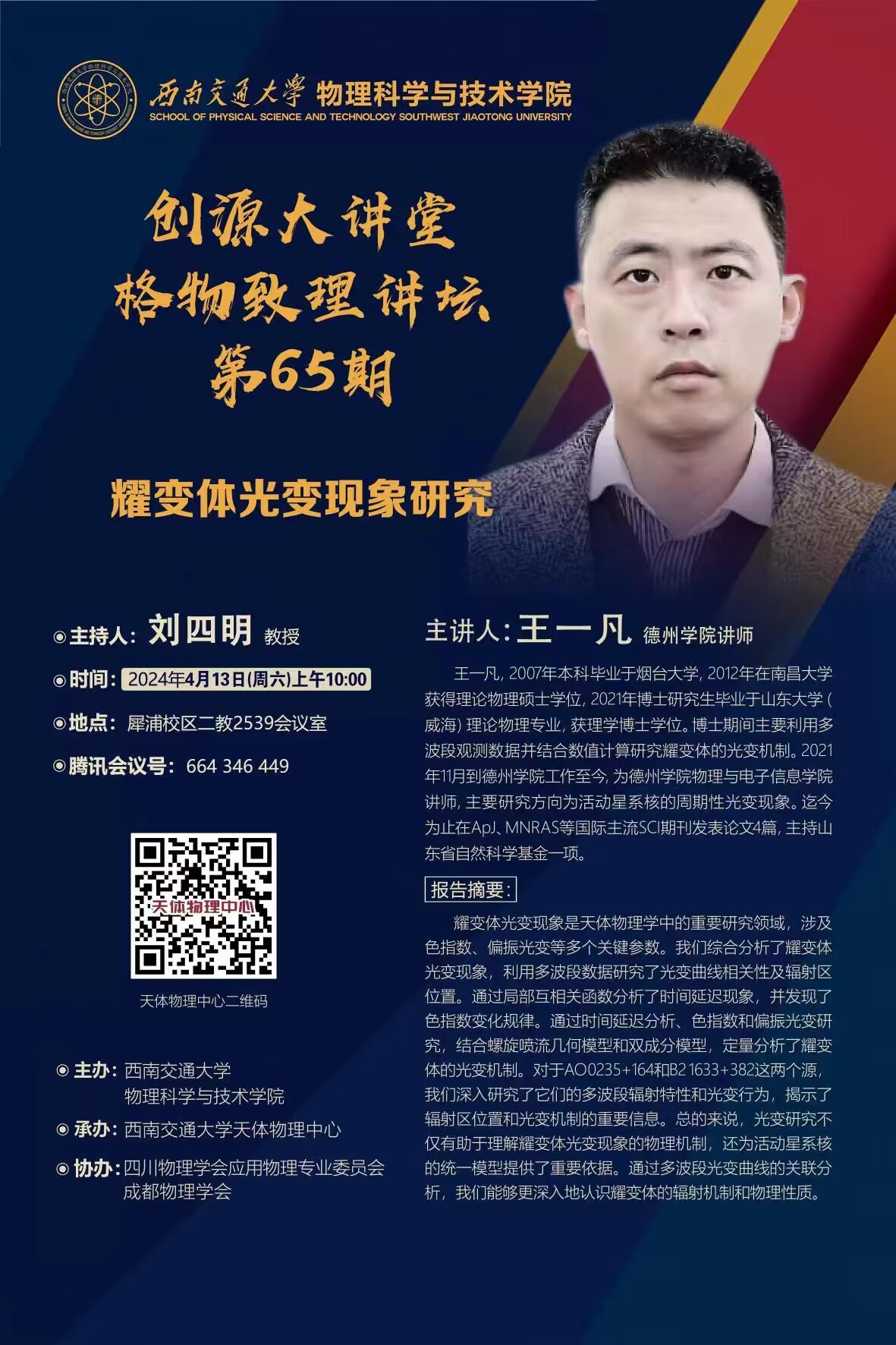 4月13日,世界杯(中国)的王一凡教师应西南交通大学刘四明教授邀请前往开展学术交流并作了题为“耀变体光变现象研究”的学术报告。