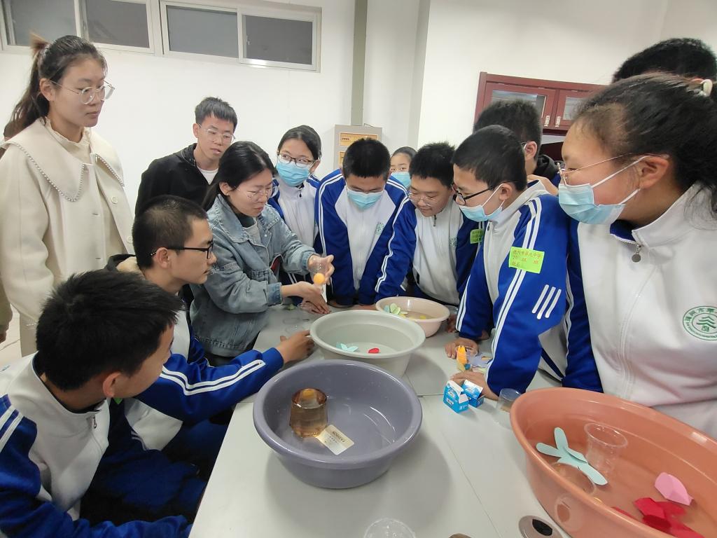 活动前期,在社团老师荆莉的指导下,社团成员们认真准备了科普小实验和中学必做的八大实验,并对实验原理和相关知识点做了详细的归纳。活动进行中社团成员们一边演示,一边用诙谐有趣的语言和学生们互动,极大地激发了学生的好奇心和求知欲。随后,社团成员们用通俗易懂的语言,解释了物理实验背后所蕴含的“毛细现象”“大气压强”“表面张力”等科学奥秘,并鼓励和指导学生们自己动手,利用道具再现各种“神奇”的实验现象,引导学生走近科学、感受科学。