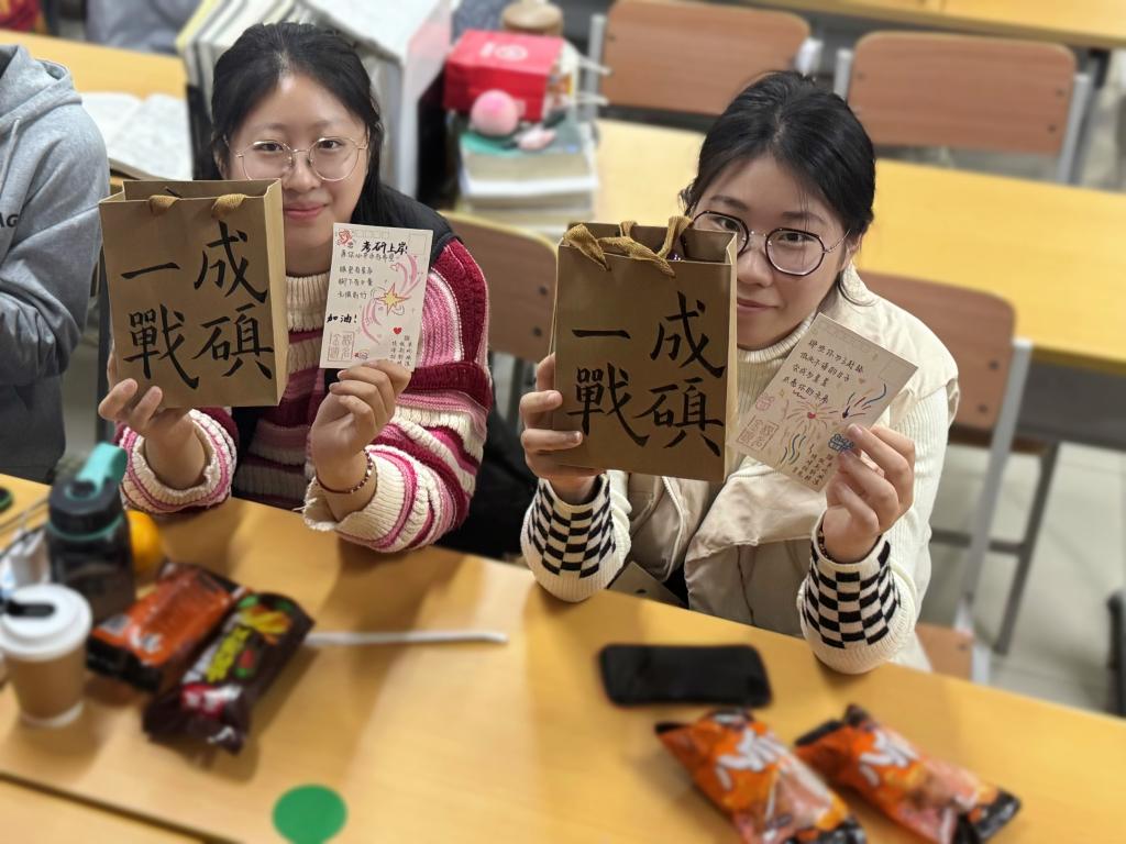 学院党委副书记主持开场后,首先低年级的学弟学妹们开始向考研学子送上亲手制作的暖心祝福卡片,一撇一捺饱含着学弟学妹们的美好祝愿,也彰显着同院学子之间的深情厚谊。