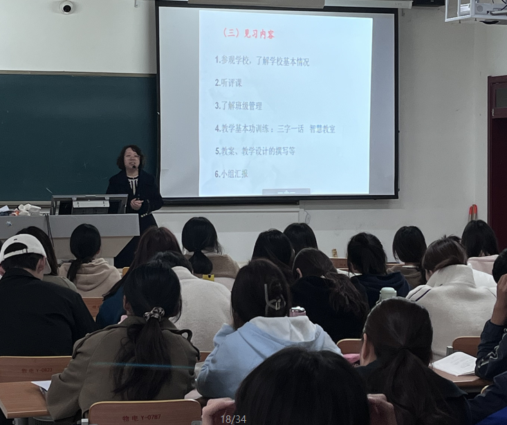 会议伊始,王老师从教育见习的课程的性质、见习内容、见习指导以及成绩评定等方面进行了详细的介绍,帮助同学们明确了实习任务、目标和方向。最后,王老师还提醒同学们在见习时要遵守纪律、服从管理、注意安全,鼓励同学们要积极提升教学技能,提高专业素养,处理好教育见习与日常学习之间的关系,为下学期的教育实习做好充分准备。